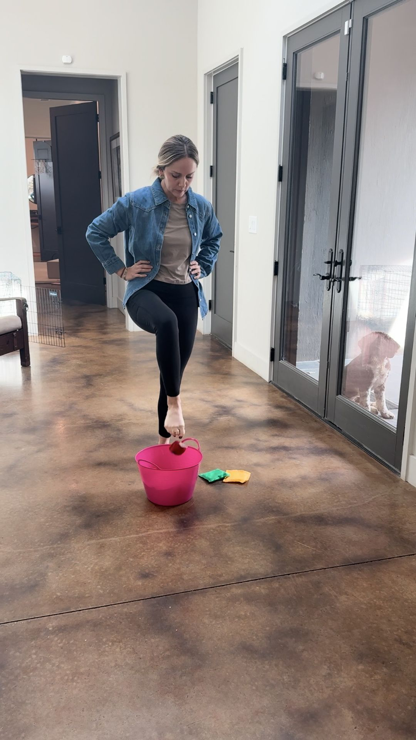 You could use clothespins or anything else here…stickers that easily peel off, paper clips on bottom seam of pants etc. Participate with your child and see who can get the most into a bucket in 30 seconds. This is also a great opportunity to work on those fine motor skills (by using something like the clothespins).
