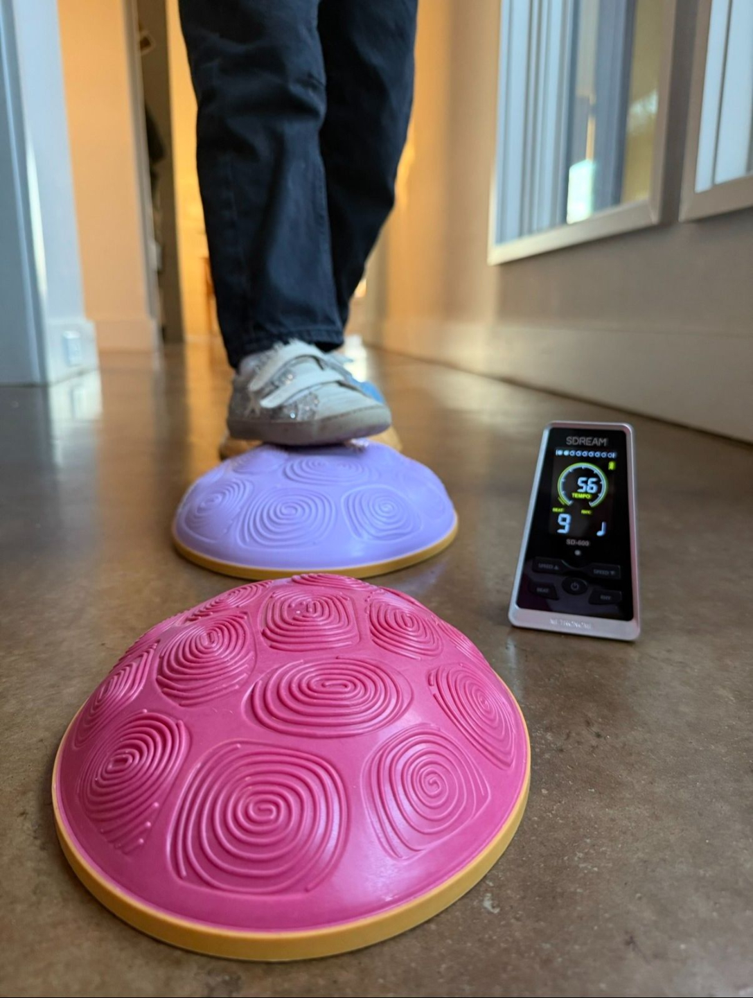 If you don’t have balance stones like the ones shown here, you can use throw pillows instead. To make this activity more challenging, have them step backward or laterally (but not until they have mastered the stepping to the metronome). Remember, start with a slow metronome and increase as they improve.